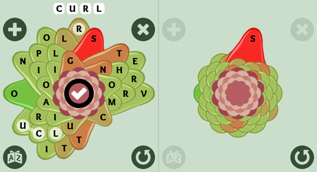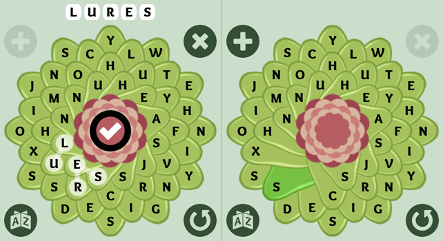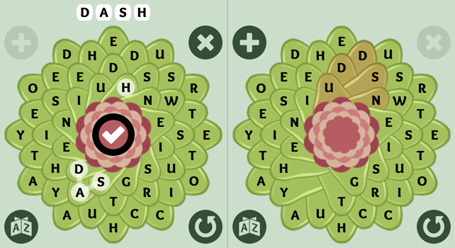 If a petal is adjacent to three or more connected letters, it will receive a bonus. Note the S in the following example: